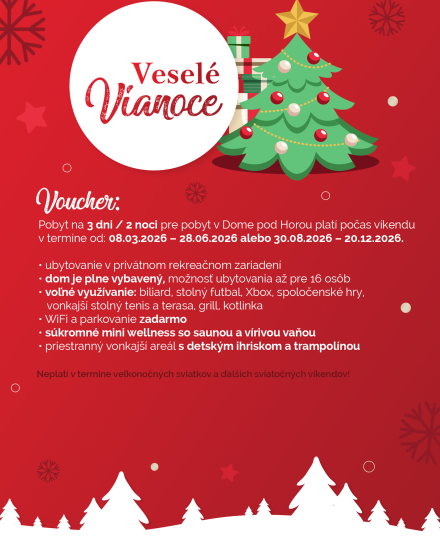 Hľadáte tip na Vianočný darček? Darčekové poukazy ktoré si pre Vás pripravil Dom pod Horou môžu byť pre Vás tou správnou voľbou! Potešte svojich blízkych víkendovýmpobytomplnýmrelaxu v srdci Jánskej doliny. Stačí vyplniť formulár a my Vám pošleme vianočný poukaz s menom obdarovaného, ktorý môžete darovať pod stromček. Majiteľ poukazu si následne môže vybrať termín ktorý mu vyhovuje a zarezervovať si pobyt.